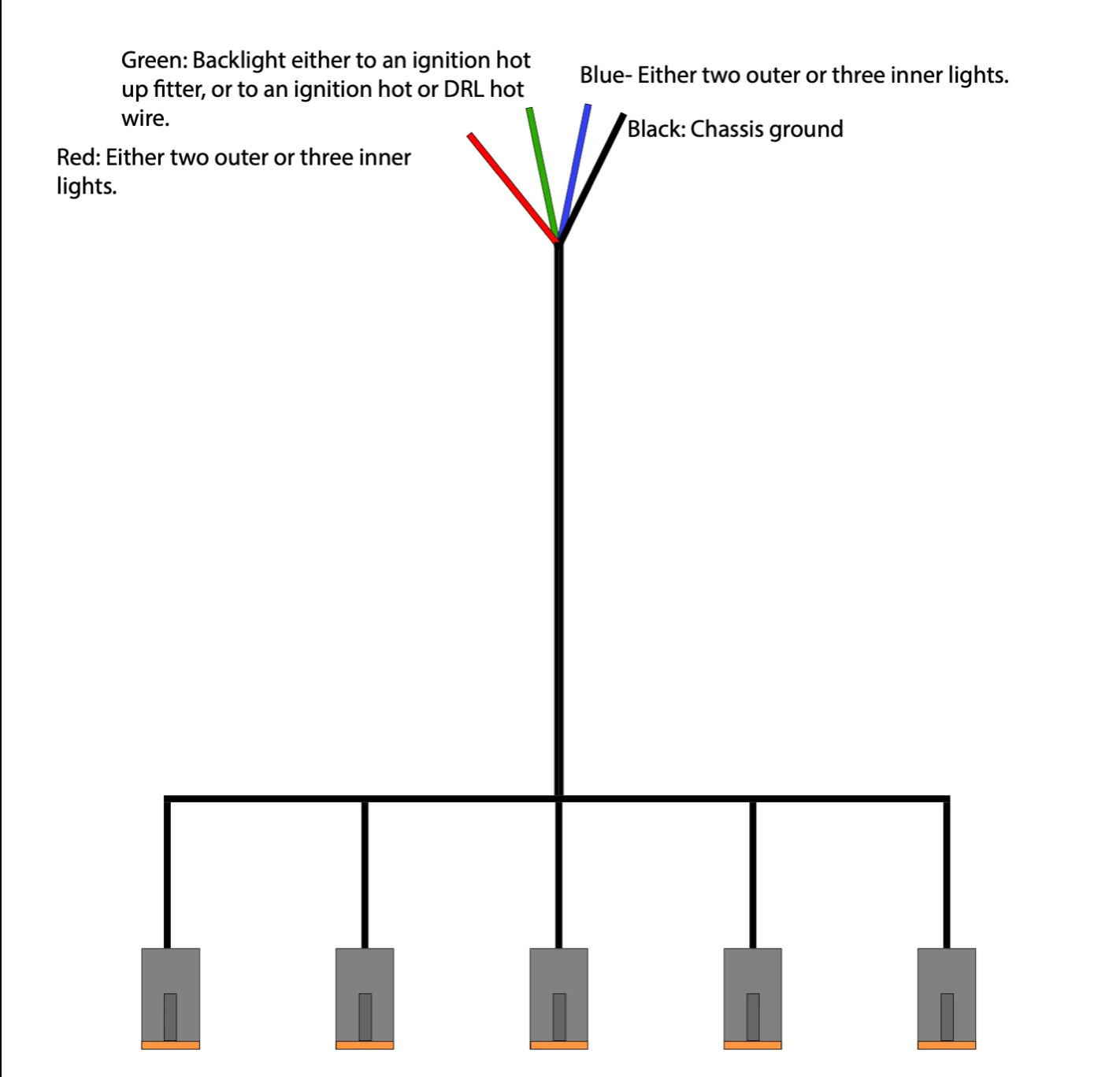 This 5 light harness is built right here in Southern California and makes it easy to wire 5 Baja Designs LP lights to the factory up fitter switches or a Switch Pros or other similar control unit on your truck. This allows control of the lights as well as back lights with ease.